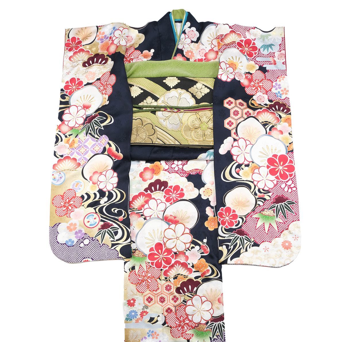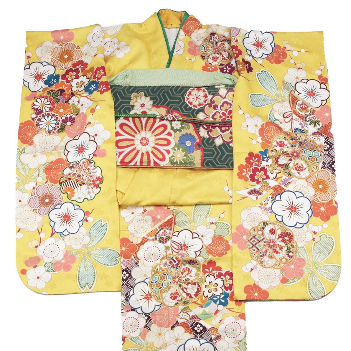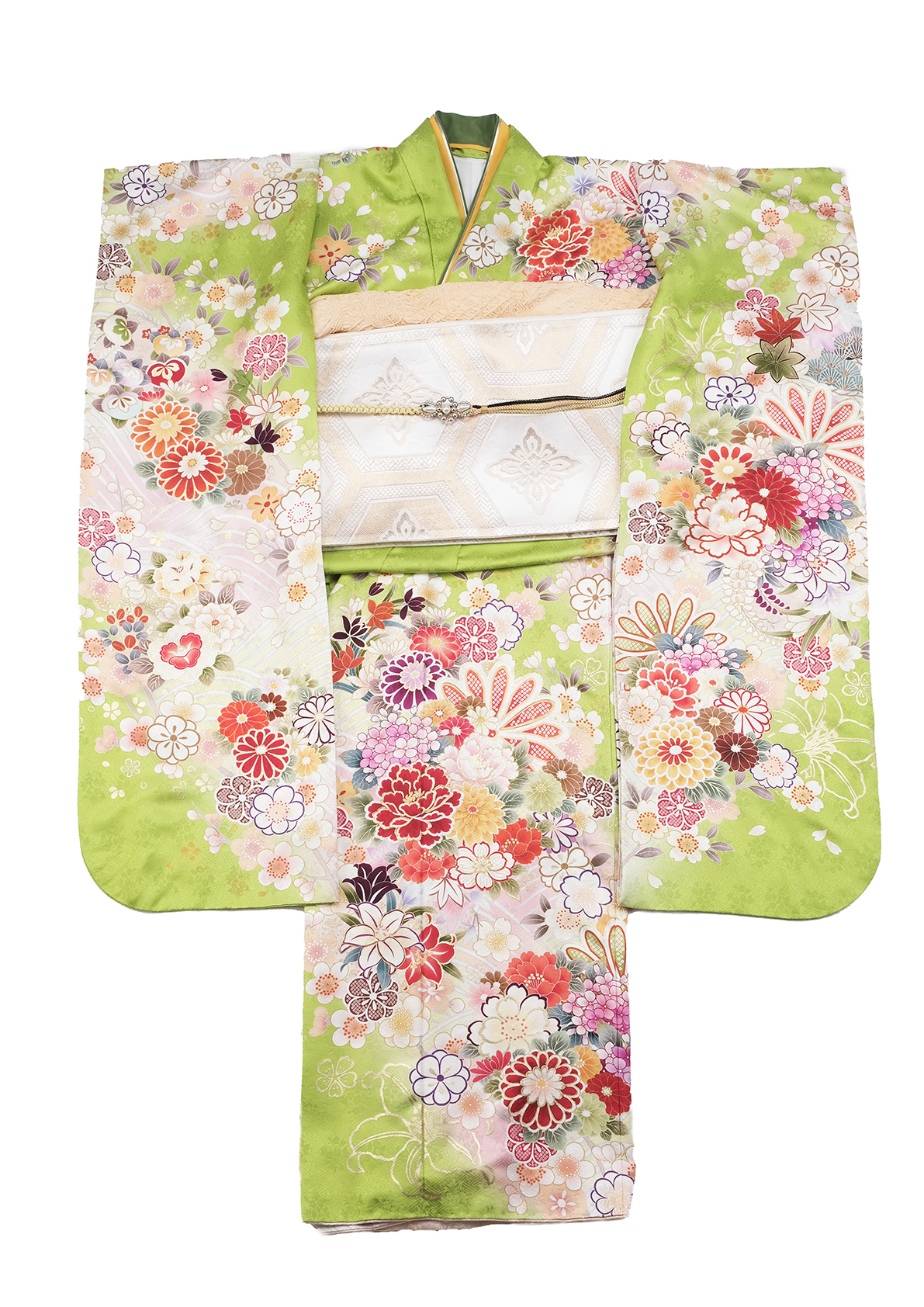 黄緑振袖 帯はシンプル