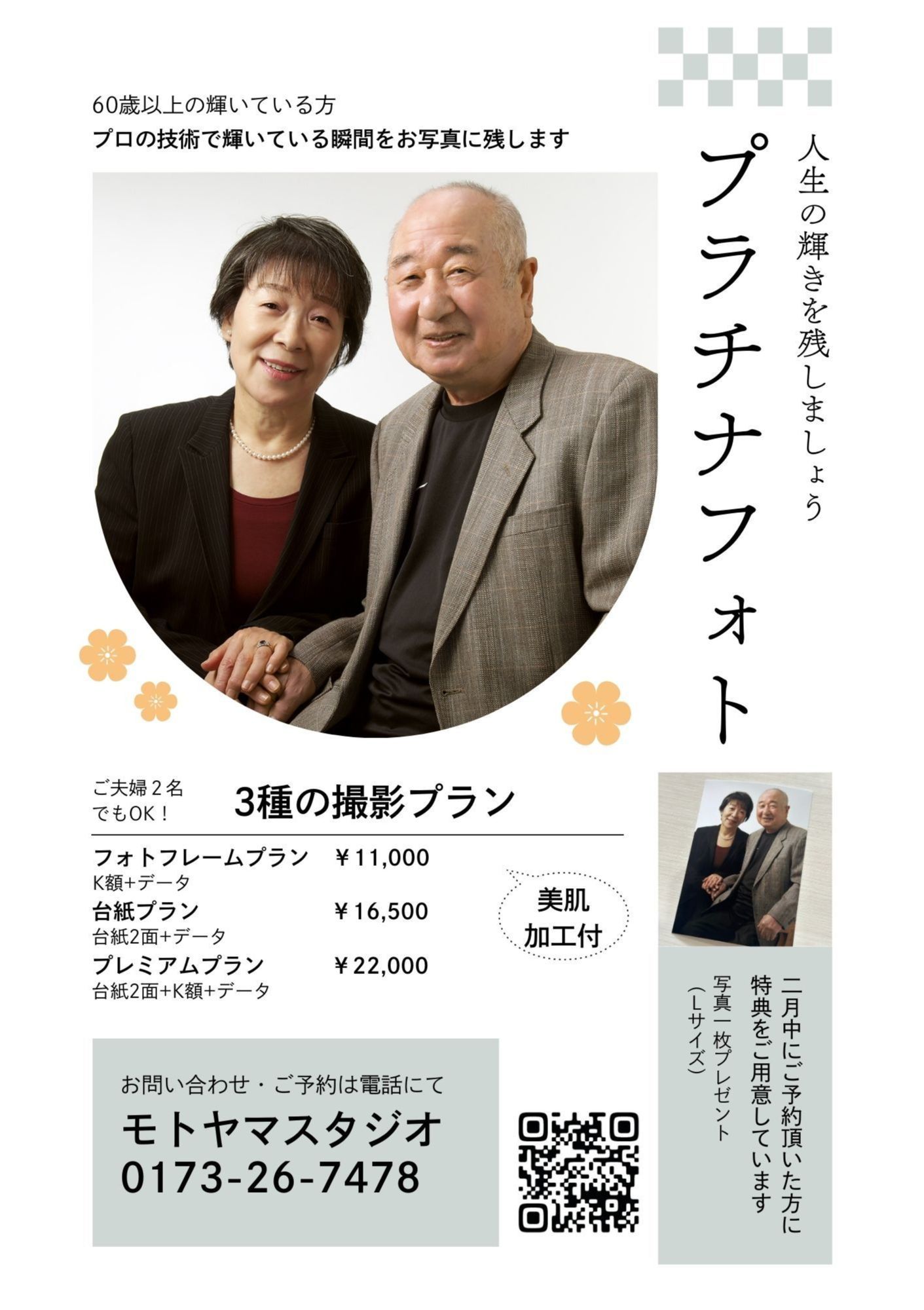 Platinum Photograph 60歳以上対象 輝いている今の姿をスタジオにて 撮影します! プラン内容は上記をご覧なってください。 ご予約は予約ページから ページトップへ MOTOYAMA STUDIO (c)2023 株式会社Unlimited Lab